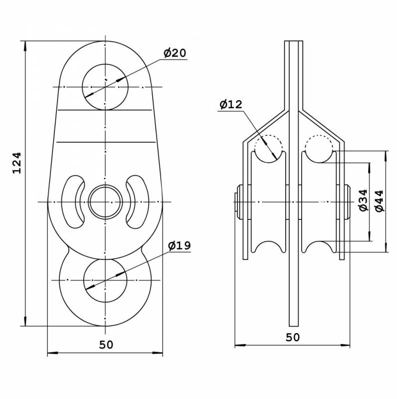 Блок-ролик предназначен для организации полиспастов, технических подъемных систем и подъема/спуска грузов. Допускает использование как одинарной, так и двойной веревки. Ролики смонтированы на одной оси. Блок имеет дополнительную точку присоединения, что позволяет создавать сложные полиспастные системы Вес, гр.: 360 Диаметр верёвки: до 11 мм Диаметр шкивов, мм: 34/44 Материал корпуса: Конструкционная сталь Материал роликов: Алюминиевые сплавы Наличие подшипников: Нет Предельная нагрузка, кгс.: 2200