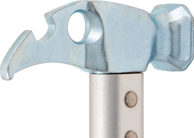 сечения 34х30 мм и клюва. В клюве расположена выемка под гайку 13 мм. Плоская центральная часть может быть использована для фиксации скального молотка на обвязке/привязи пользователя с помощью магнитной защелки. Также в центральной части расположено отверстие диаметром 14 мм для позиционирования молотка с помощью карабина на обвязке/привязи пользователя.
