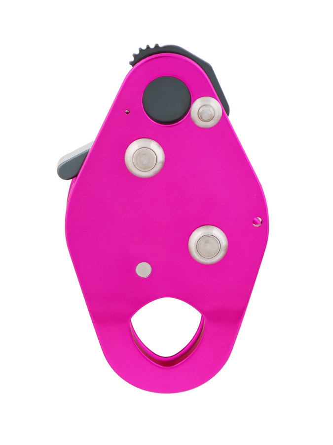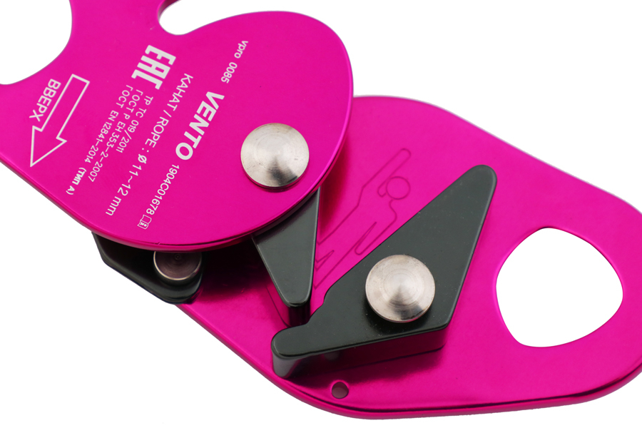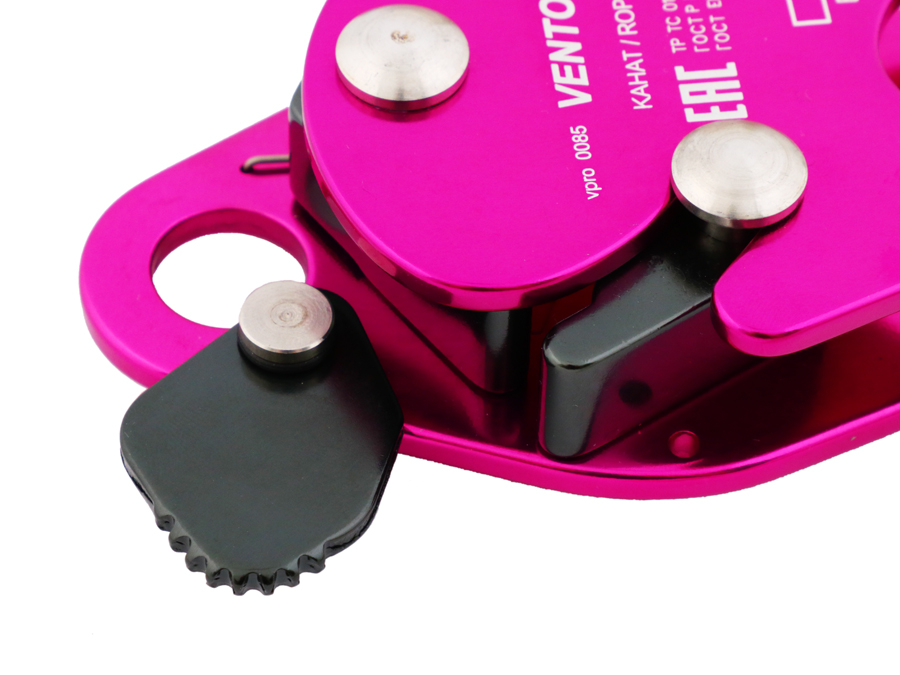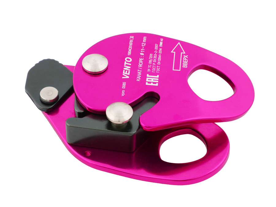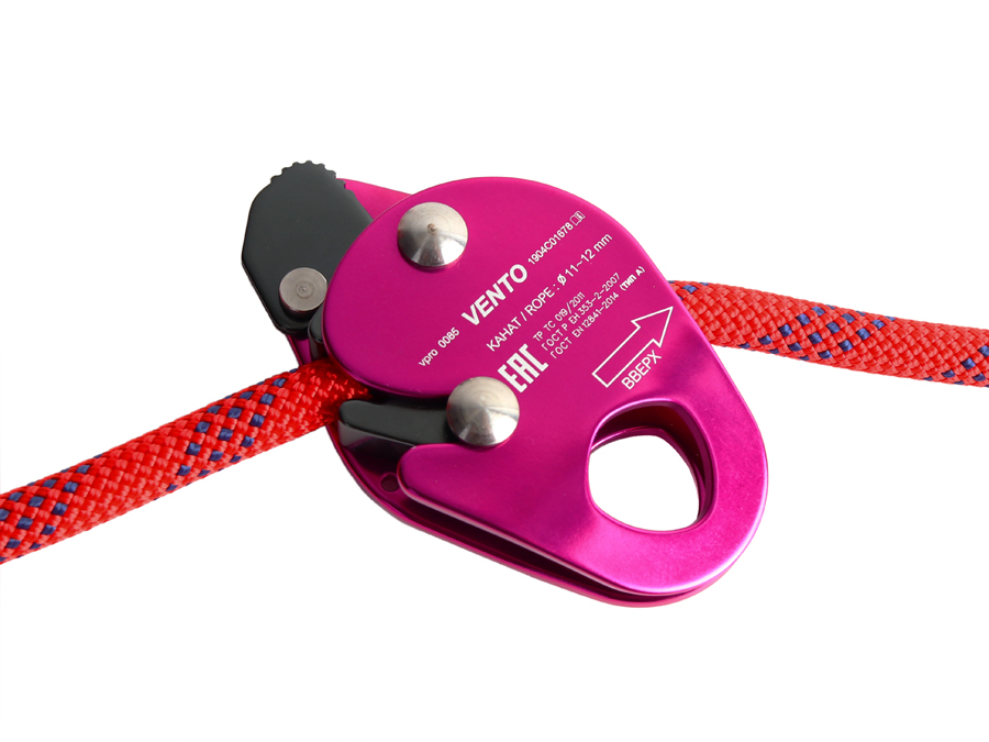 Зажим перегибного типа. Работает в двух режимах: незакрепленный и фиксированный. При первом обеспечивается свободное движение по веревке/ канату вверх и вниз, при втором — устройство передвигает вверх пользователь.
