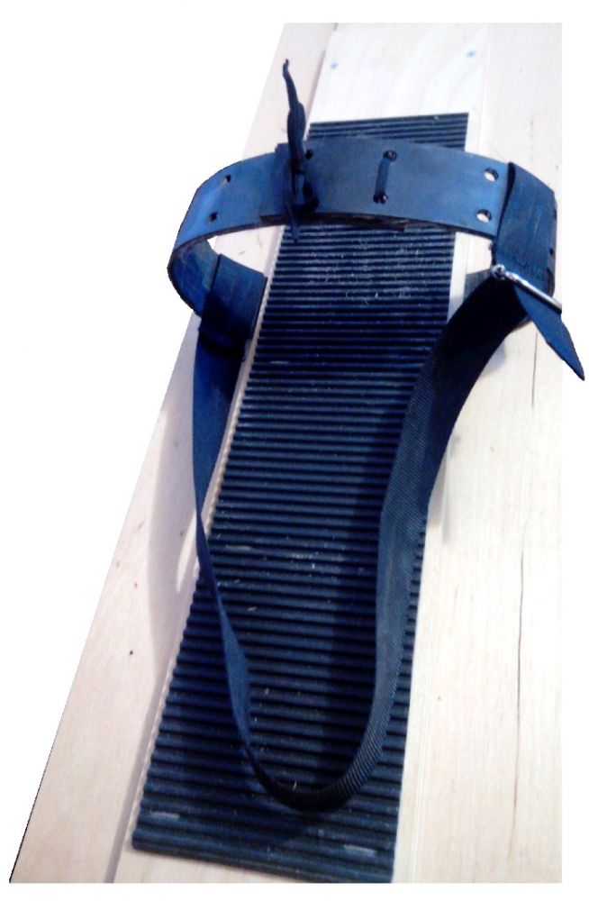 Комплект креплений для охотничьих лыж. Отличительной чертой данного крепления является то, что носковой ремень изготовлен из транспортерной ленты (армированная резина). Это делает эксплуатацию лыж с таким креплением комфортным, затрачивается меньше усилий, если нужно быстро снять лыжи или одеть. Носковой ремень всегда держит форму . Амортизатор(накладка) изготовлен из рифленой резины. Запятник сшит из прочной ленты для стропы и снабжен регулируемой стопорной рамкой