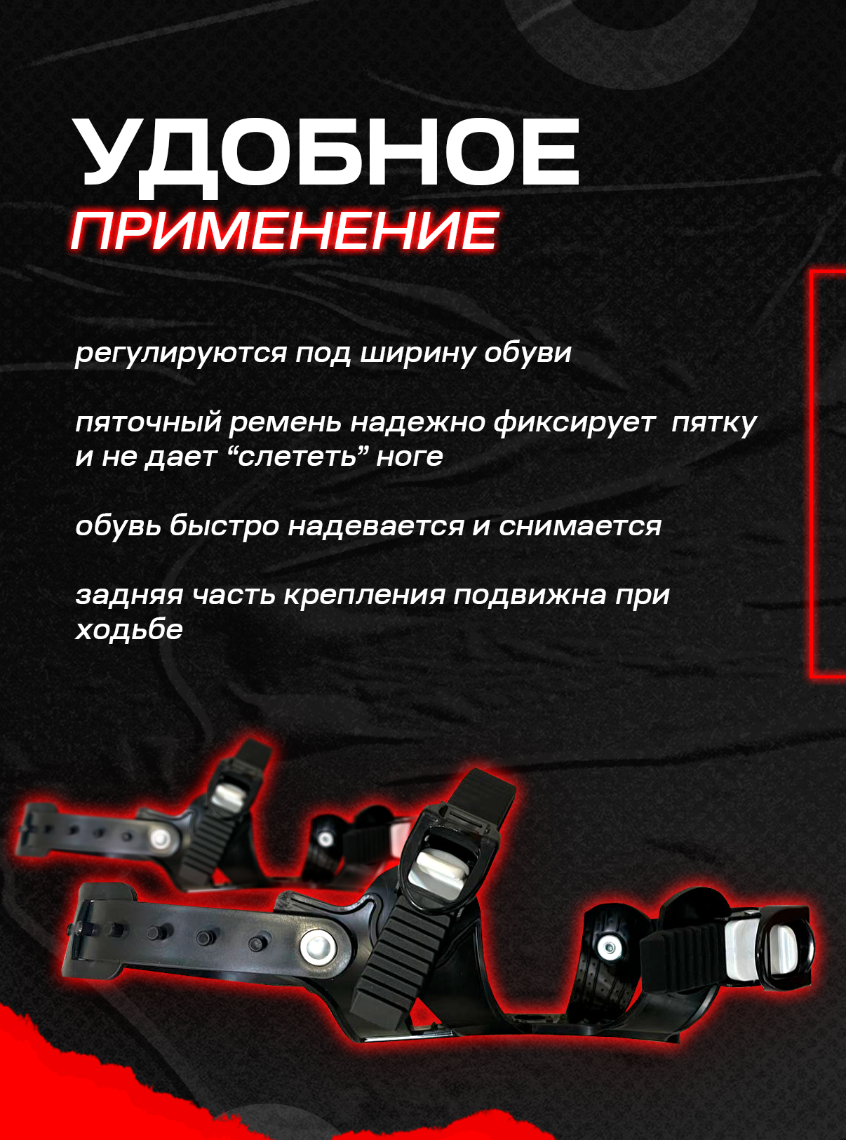 Представляют собой морозостойкую пластиковую деку с двумя жесткими, удерживающими ногу, ремешками и одним пяточным ремнем. Затяжка жестких ремней осуществляется с помощью специальных защелок, позволяющих быстро и надежно зафиксировать ногу и также быстро ослабить затяжку. Данные крепления более удобны в использовании , чем стандартные (брезентовые и кожаные) , т.к. два ремня обеспечивают лучшую маневренность при ходьбе, а новая система защелок облегчает эксплуатацию. Полужесткие крепления всегда держат форму, не намокают и не вытягиваются.