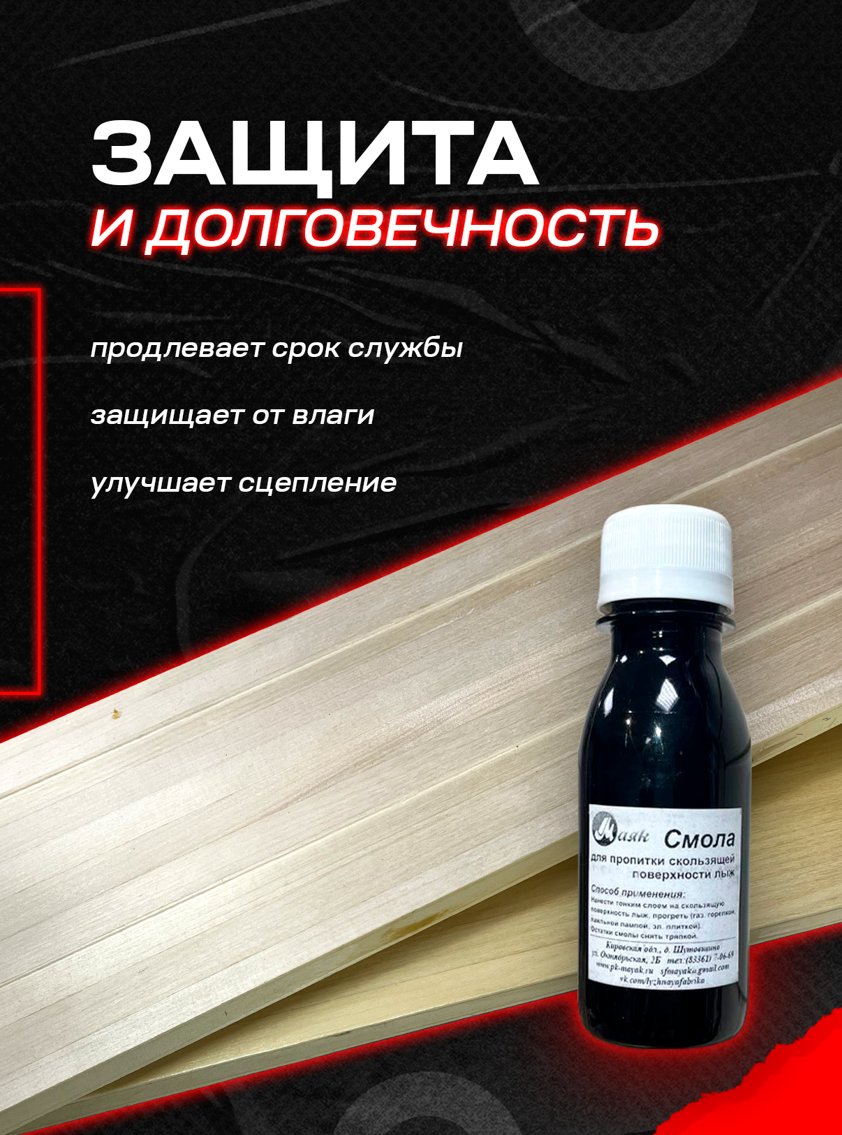 Смола применяется для пропитки скользящей поверхности деревянных промысловых и беговых лыж. Это противодействует попаданию влаги в древесину лыж и предотвращает коробление. Чем качественнее будет пропитана скользящая поверхность, тем долговечнее будут лыжи. Поэтому смоление – второе по значимости действие, после подбора деревянных лыж Скользящую поверхность необходимо разогреть паяльной лампой, утюгом или другим источником тепла и затем нанести смолу. Проследить, чтобы смола покрыла всю поверхность, и подождать, пока она не впитается. После этого излишки смолы убрать тряпкой. При частом использовании деревянных лыж смоление производить по мере истирания скользящей поверхности. Фасовка: 70гр в ПЭТ-бутылке.