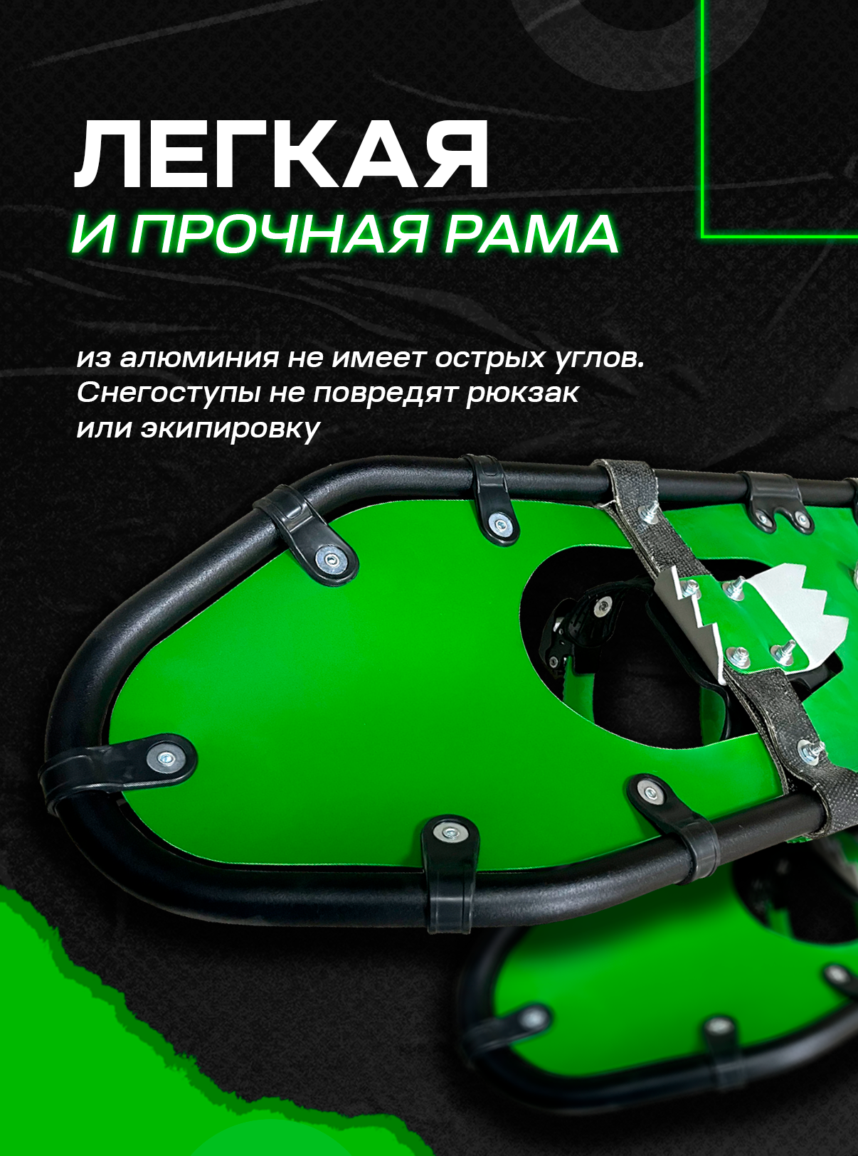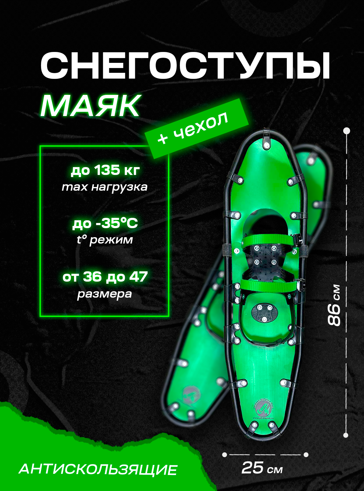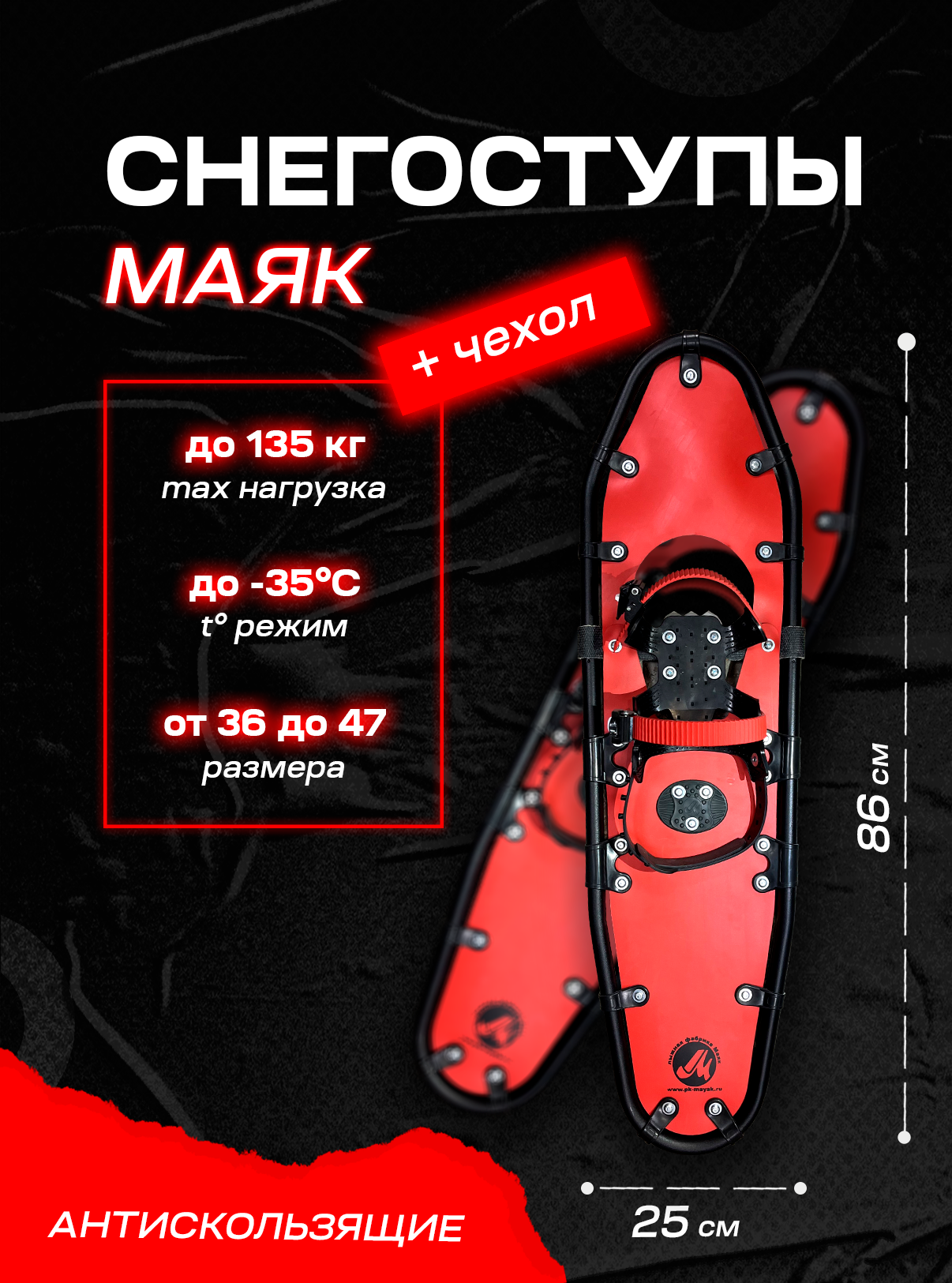 Снегоступы Маяк Размер деки: 86x25 см Рабочая нагрузка: 100-135кг Материал рамки: алюминиевый сплав Крепления универсальные, подходят для большинства типов обуви. Оснащены кошками.