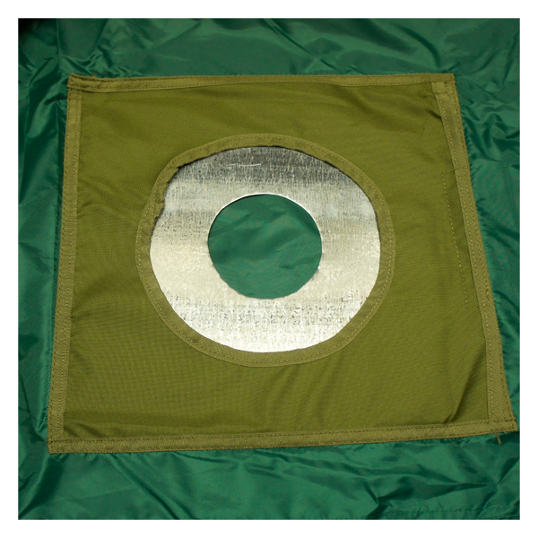 В верхней части бани вшит специальный карман, для трубы печки. При такой установке нужно вставить жаропрочное полотно (н-р.: лист метала) с отверстием для дымохода.
