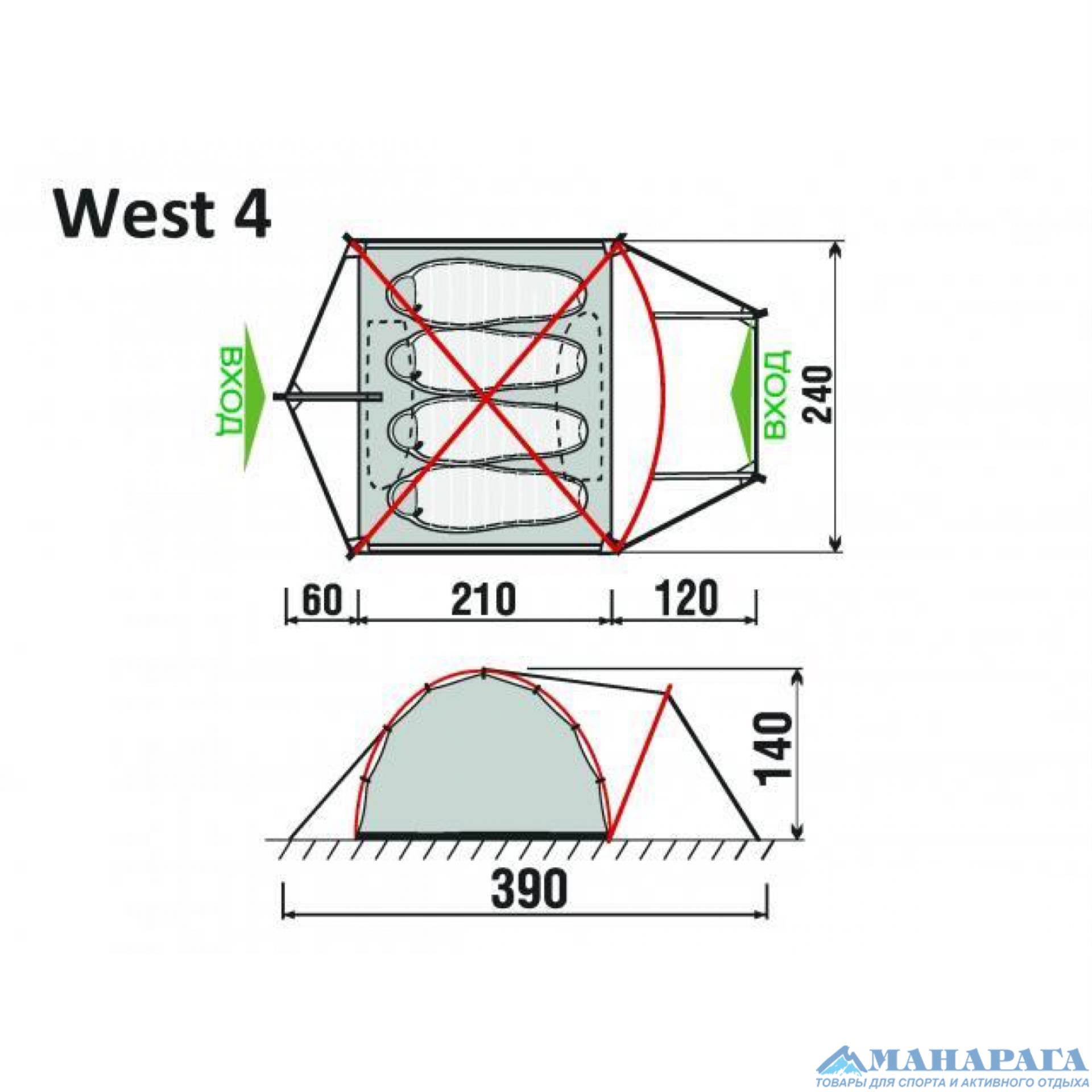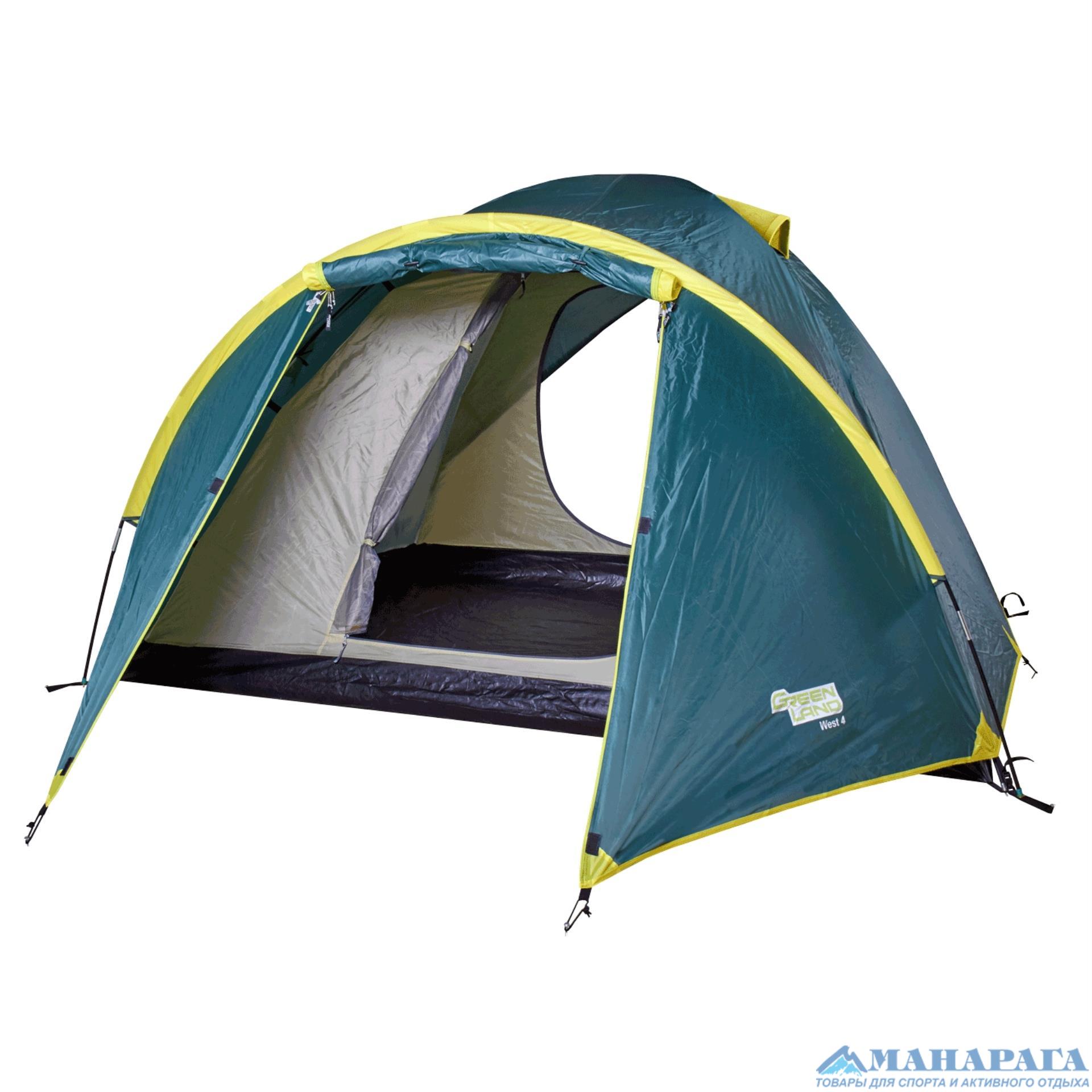 Green Land West 4 двухслойная палатка куполообразной формы, которая имеет два входа и два тамбура. Один из тамбуров увеличенного размера для удобства размещения всех необходимых вещей. При необходимости в нем можно готовить в непогоду на газу. Особенности - Вместимость (человек): 4 - Габариты внешние: 390x240x140 - Габариты внутренние: 210x240x135 - Ткань тента: 100% полиэстер 75D/190T PU 3000 мм в ст - Ткань палатки: 100% дышащий полиэстер - Ткань дна: tarpauling - Противомоскитная сетка на входах в палатку - Каркас: внутренний, Fiberglass 8,5 mm - Все швы проклеены - Два вентиляционных окна на тенте - Внутри палатки подвесная полочка и два боковых кармана - Шесть штормовых оттяжек - Все силовые узлы палатки имеют усиление - Вес 5 кг
