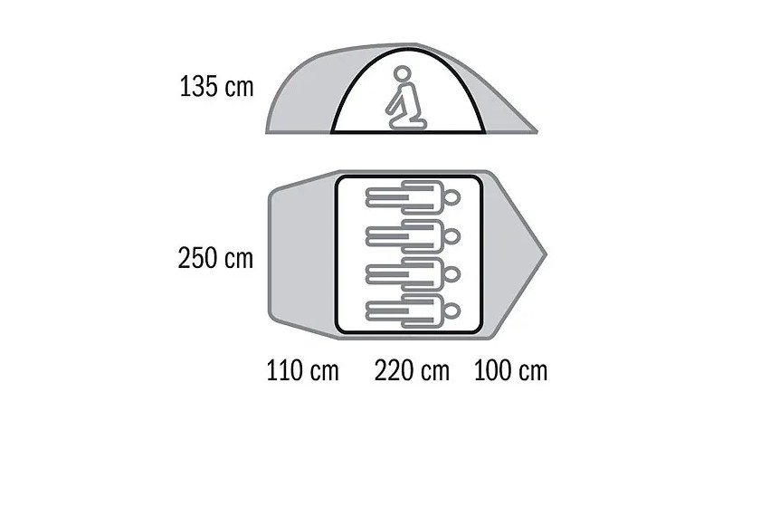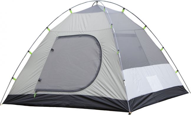 Палатка кемпинговая, 4-местная с внутренней палаткой, геометрия: полубочка внешний каркас, алюминиевые дуги 2 входа / одна комната вес 5.10 кг водостойкость тента: 3000 мм в.ст водостойкость дна: 6000 мм в.ст внешние размеры (ДхШхВ) 430х250х135 cм внутренние размеры (ДхШхВ) 220х250х135 cм Аксессуары: сумка для переноски, оттяжки, колышки из стали, ремкомплект