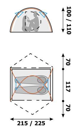 Вентиляция: два входа, дублированные москитными сетками и два вентиляционных окна на торцах внутренней палатки и тента.
