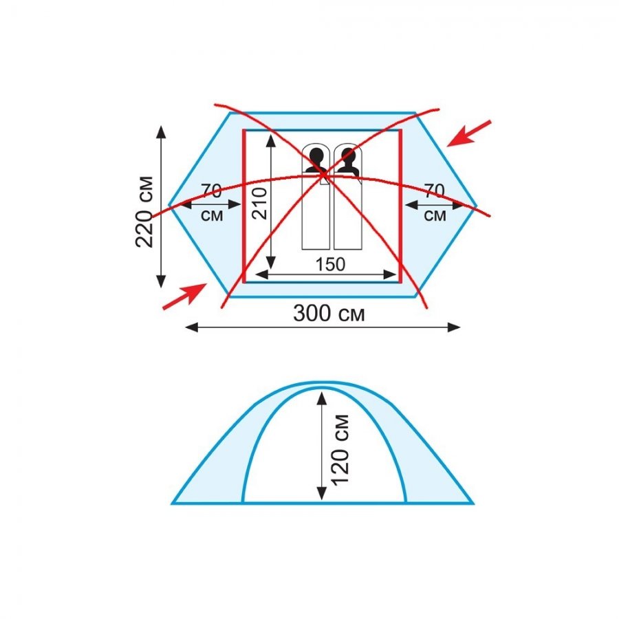 Внешние дуги сильнее натягивают наружный тент, за счет чего конденсат быстрее скатывается по его внутреней поверхности, не затекает в спальный отсек.