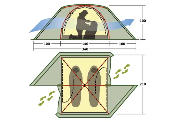 Палатка устойчива даже в сильный ветер, на внешнем тенте расположено 6 оттяжек с двумя точками крепления и 4 оттяжки с одной точкой крепления на тенте. Оттяжки можно регулировать по длине.