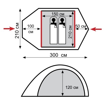 Двухслойная трекинговая палатка с ветроустойчивой конструкцией. Все швы проклеены, ткань имеет водоотталкивающую обработку и огнеупорную пропитку. Благодаря материалу — 100% дышащий полиэстер и конструкции, в палатке очень хорошая вентиляция. Летом внутри очень комфортно. В холодное же время года рекомендуется использовать спальный мешок. Внутренняя палатка оборудована москитной сеткой, карманами для снаряжения, полочкой для мелких вещей. Наружный материал — Polyester 190Т Тент, см — 300х210х120 Спальное место, см — 210х150 Стойки, дуги, мм — Фиберглас Водостойкость тента, мм в. ст. — 4000 Водостойкость пола, мм в. ст. — 5000 Масса, кг — 4 Мест — 2-3 Количество входов — 2