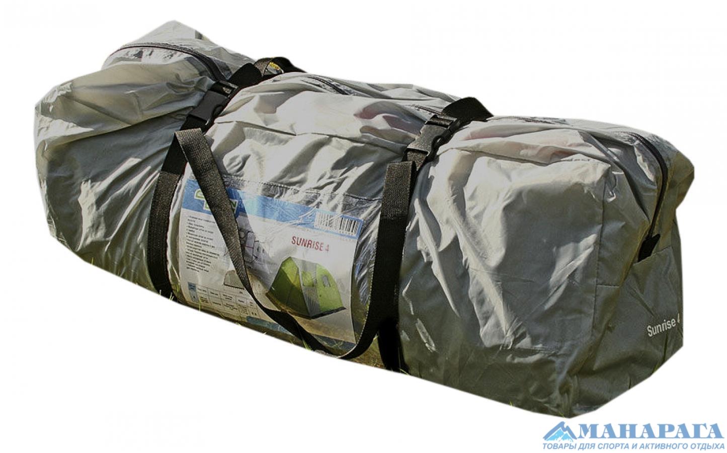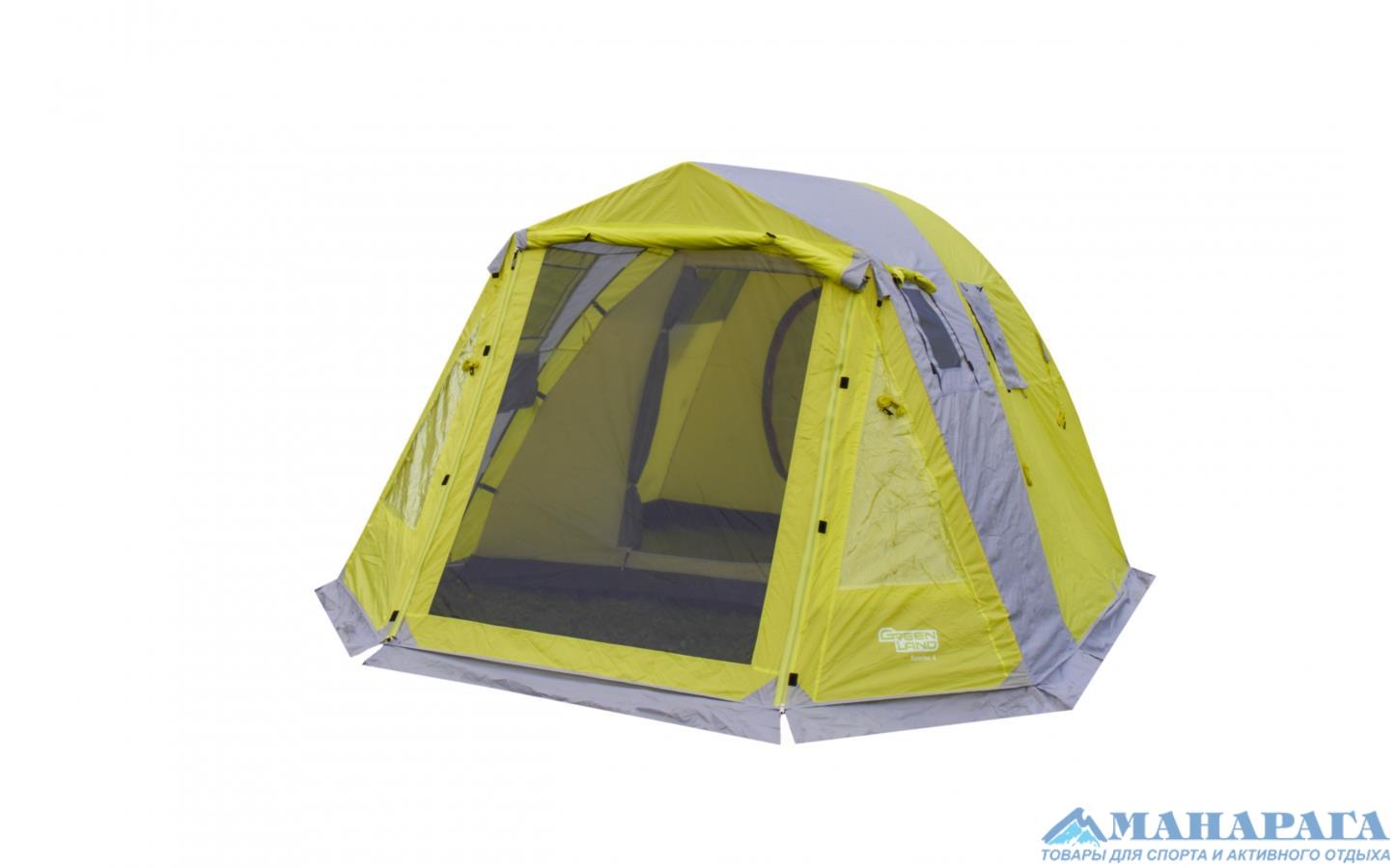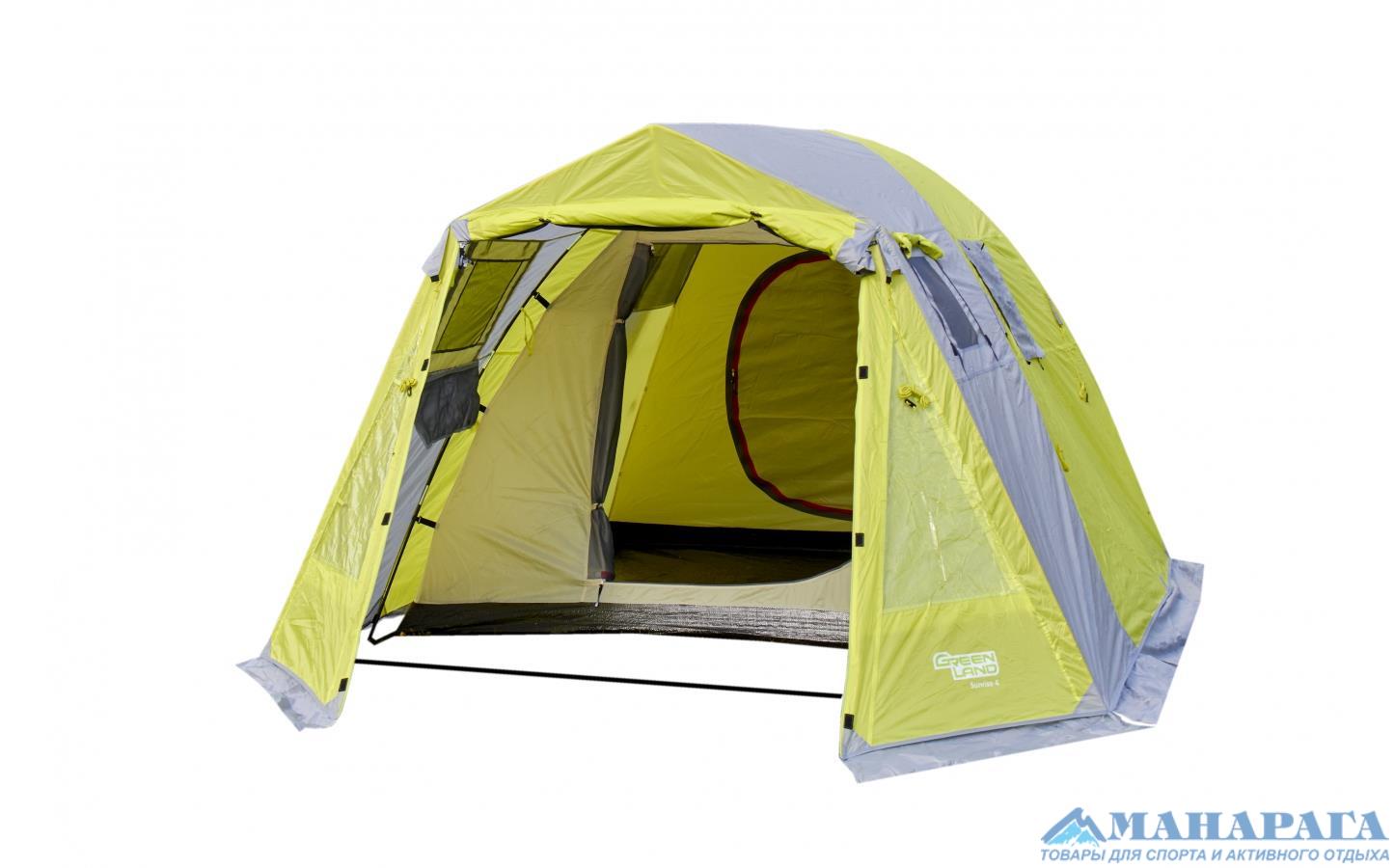 Кемпинговая палатка GreenLand Sunrise 4 предназначена для отдыха на природе. Возможна установка в одиночку, имеется один вход и один тамбур. Внутренняя палатка ставится на каркасе из пластиковых дуг. Дуги сходятся в металлический хаб, к которому присоединяется каркас тамбура из стальных трубок. После этого на палатку набрасывается тент. С обратной стороны от треугольную форму и оттягивается колышком. Это сделано для того, чтобы большая задняя стенка тента не прикасалась к внутренней палатке, что исключает протекание в сырую погоду. Двери внутренней палатки полностью дублированы москитной сеткой, открываются вбок и не мешают при входе-выходе. В верхней части купола внутренней палатки большие вентиляционные окна. Напротив них, в тенте, тоже есть два окна, закрытые москитной сеткой. В дождь эти окна на тенте закрываются непромокаемыми шторками на молнии. Аналогичные два окна есть и в передней части тента, в тамбуре. Кроме того, в тамбуре есть окна из прозрачного пластика, которые можно закрыть изнутри шторкой. Дверь на входе в тамбур имеет москитную сетку. C помощью металлических стоек, входящих в комплект, можно дверь тамбура поднять и превратить в козырек над входом. Палатка упаковывается в просторную сумку на молнии, предусмотрены две стяжки с фастексами для уменьшения объема.