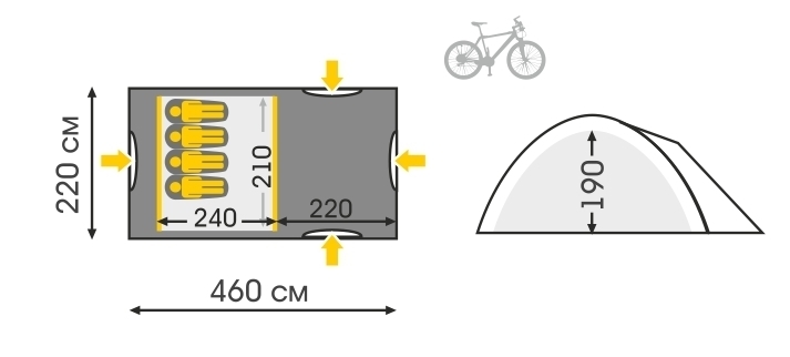Идеальная кемпинговая палатка для вело-туристов с большим спальным отделением и удобным тамбуром для велосипедов Кемпинговая двухслойная палатка с большим тамбуром. ХАРАКТЕРИСТИКИ: - Внешний тент устойчив к UV излучению; - Внешний тент имеет противоискровую обработку; - Ветрозащитная юбка; - Вентиляционное окно и окно в тамбуре; - Вход в тамбур с москитной сеткой; - Оттяжки со светоотражающими элементами; - Все швы проклеены; - Съемный пол в тамбуре; - Ремонтный набор в комплекте. Размеры: (ШxДxВ): 460х220х190 см Размеры в упаковке: 69х22х22 см Вес: 8,8 кг Тент: Polyester RipStop 190Т/75D 5000 мм Дно: армированный ПЭ Внутренняя палатка: Дышащий Polyester Дуги: HQ FiberGlass 11 мм и 9,5 мм + сталь 16 мм Кол-во человек: 4 Входы: 4 Сезонность: весна, лето, осень