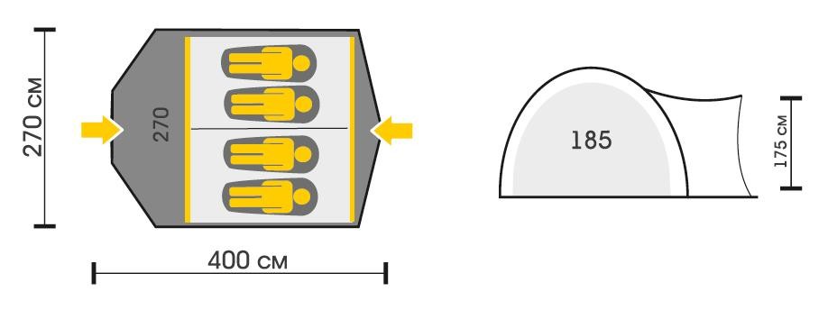 - Внутренняя палатка имеет два соседних входа и разделена изнутри съемной перегородкой.