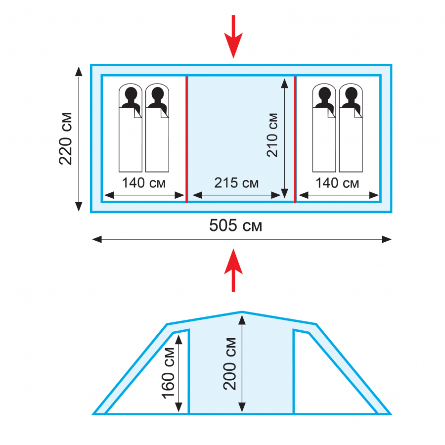 • Размер внутренней палатки, см (210х140х160)х2