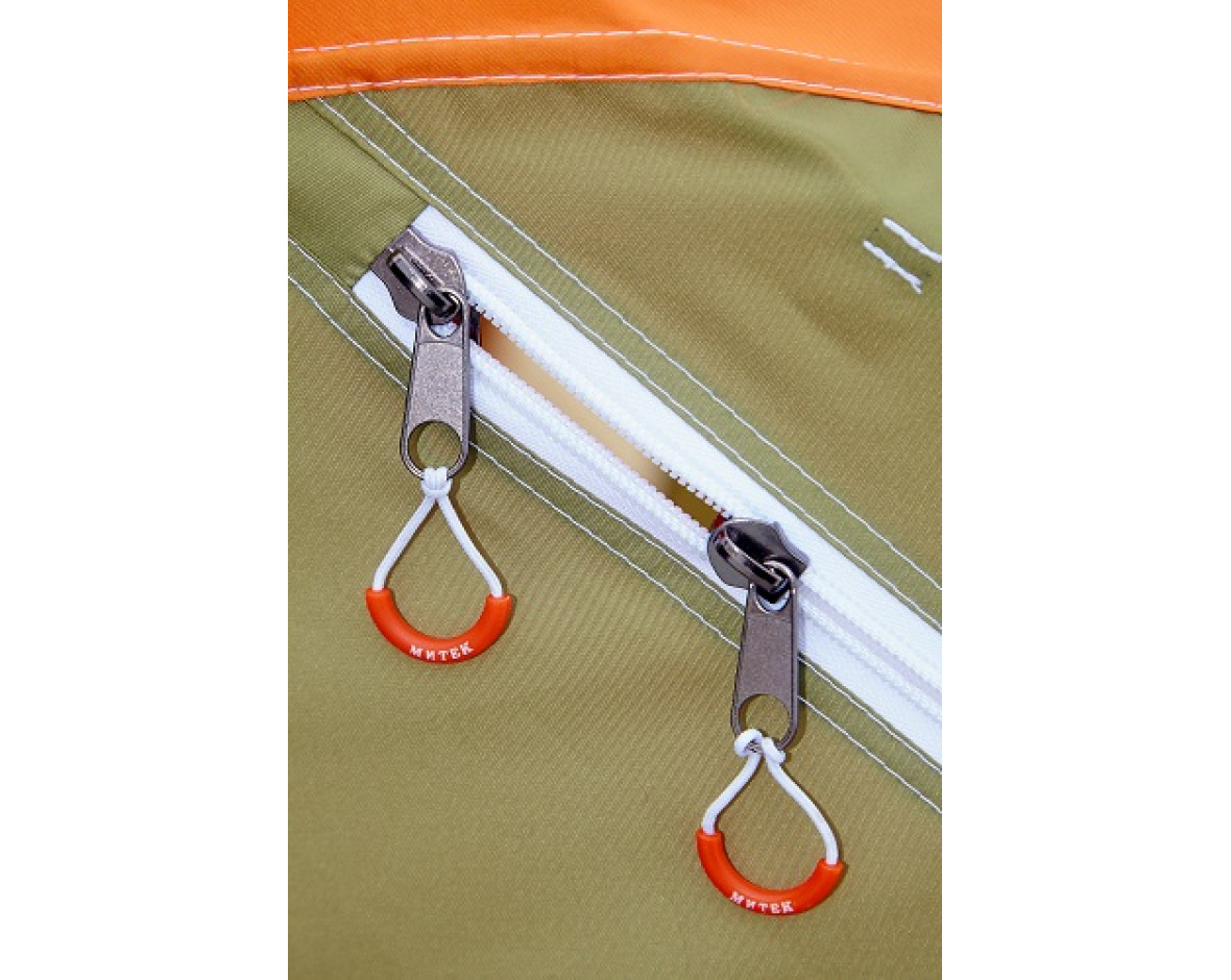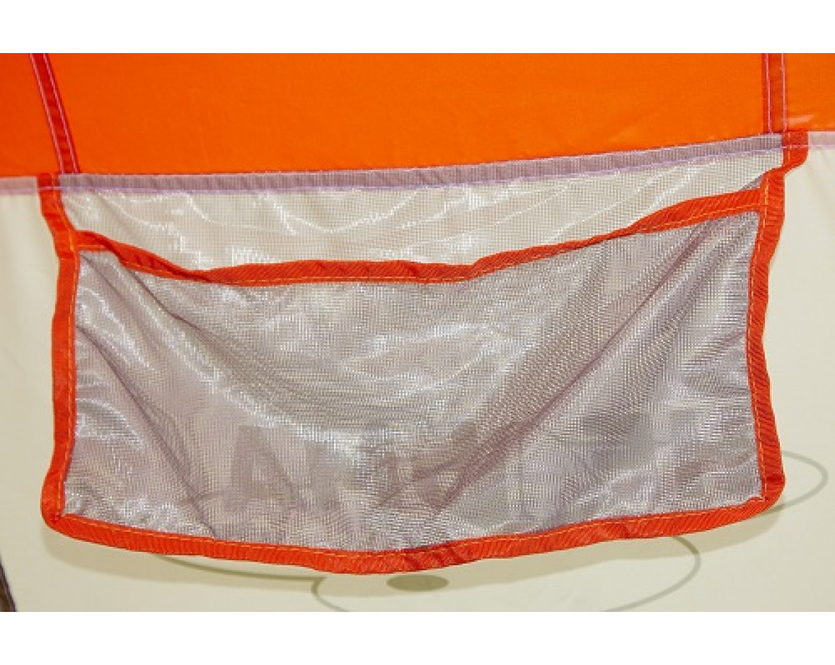 Дизайн палатки - характерный для линейки зимних палаток Митек: ярко-оранжевый купол и чередование светлых и темных цветов внизу.