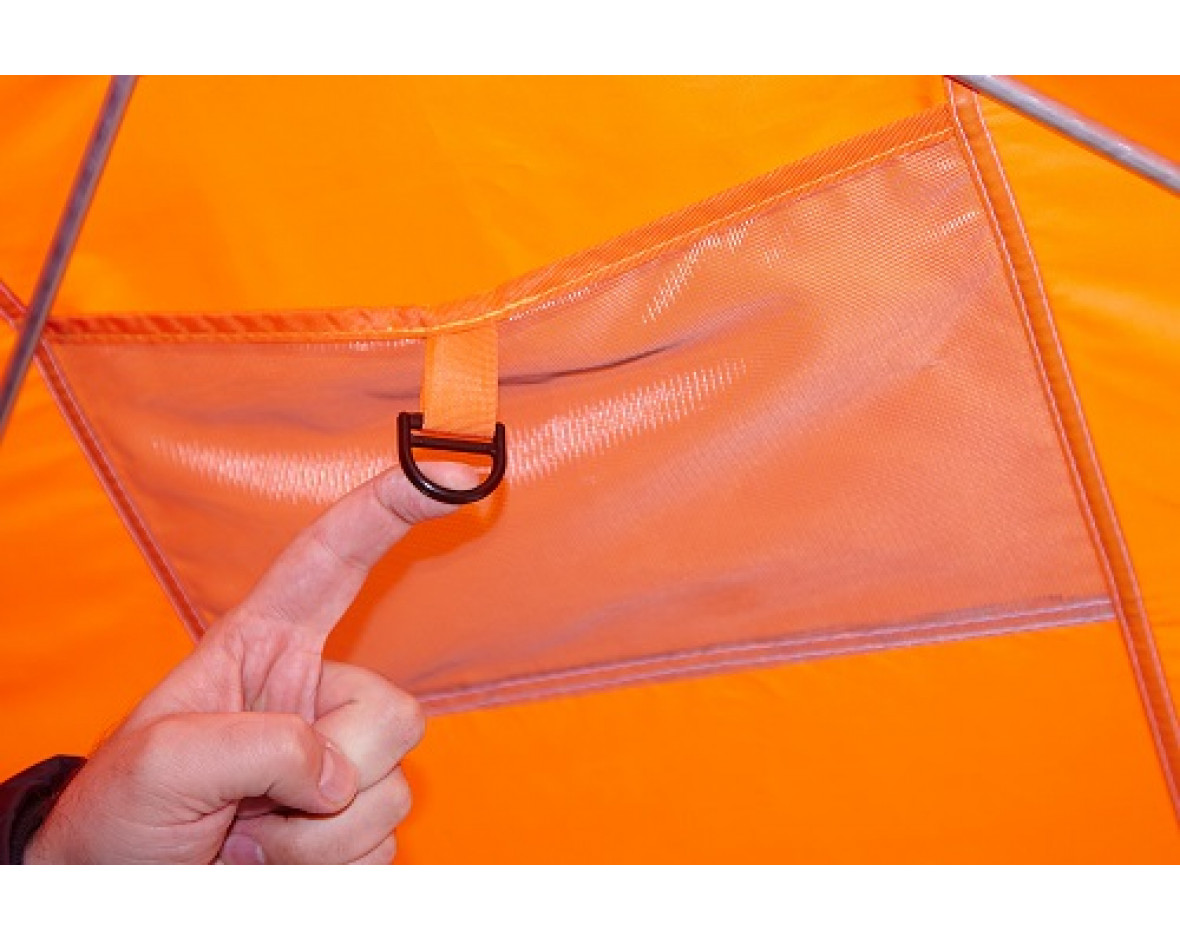 Для вентиляции в палатке предусмотрены клапаны с козырьками, защищающими от попадания снега внутрь. Также в палатке имеются 2 окна со шторками, под которыми находятся прозрачные окошки из специального морозостойкого материала. Окна крепятся на липучках, и их можно полностью отсоединить.