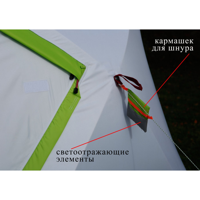 Палатка оснащена каркасом высокой жесткости с системой компактного сложения, в которой применен принципиально-новый запатентованный гибкий фиксируемый узел. Дизайн палатки выполнен в бело-салатовом цветовом исполнении с использованием светопроводящих тканей.