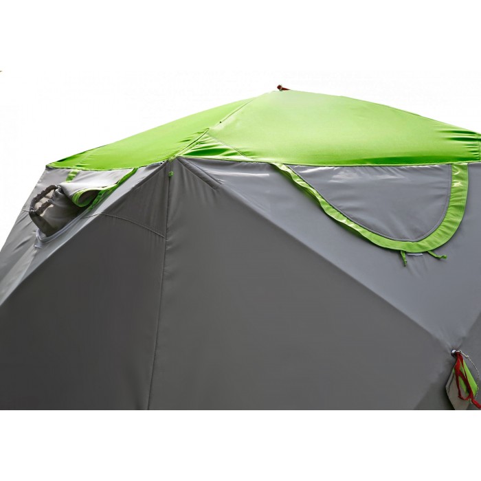 Надежная защита палаточного укрытия от дождя и солнечных лучей, при сохранении высокой ветроустойчивости конструкции в целом обеспечивается защитным тентом (опция), устанавливаемым над палаткой с образованием воздушного зазора между тентом и куполом палатки.