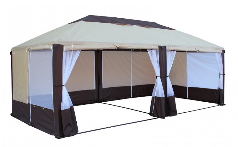 Тент шатра выполнен из полиэфирной ткани oxford 300D PU 2000 с водоотталкивающей пропиткой (водостойкостью 2000 мм водяного столба), устойчивой к воздействию солнечных лучей.