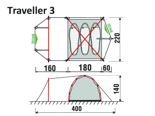 Green Land Traveller 3 кемпинговая палатка с тремя полноценными спальными местами, достойным набором функций, огромным тамбуром. Два входа и два тамбура, один из которых сделан компактным, а второй (1,6 м) подойдет для склада вещей и снаряжения, либо приготовления пищи. Тамбур оснащен двумя входами и вентиляционными окнами. Москитные сетки, проклеенные швы, двухбегунковые молнии, а также удобная полочка и два боковых кармана во внутренней палатке. Штормовые оттяжки в количестве шести штук. Особенности: - Швы проклеены - Два входа и два тамбура, один увеличен для удобства размещения вещей или приготовления пищи в палатке - Вентиляционные окна на тенте - Москитная сетка на входах во внутреннюю палатку - Внутри палатки полочка и два боковых кармана - Шесть штормовых оттяжек - На всех молниях два бегунка - Вес, кг 5 - Тент 3000 mm Polyester 70D 185T - Внутренняя палатка 210x180 - Дно Tarpauling - Размер, см 400х220х140 - Водостойкость тента, мм в.ст. 3000 - Количество мест 3 - Каркас Фибергласс Ø 8.5 mm