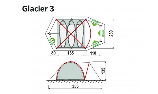 RockLand Glacier 3 трехместная палатка куполообразной формы для туризма и активного отдыха, два входа и два тамбура, один из которых увеличенного размера, что позволяет разместить там все необходимое. Особенности: - Швы проклеены - Два входа и два одинаковых тамбура для удобства размещения вещей - Вентиляционные окна на тенте с ветрозащитным клапаном - Москитная сетка на входах во внутреннюю палатку - Внутри палатки полочка и два боковых кармана - Восемь штормовых оттяжек - На всех молниях два бегунка - Возможна установка без внутренней палатки - Ремнабор в комплекте - Вес: 4.8 кг - Количество мест: 3 - Ткань внутренней палатки: Polyester Taffeta 185T - Материал дна:Polyester 150D Oxford 8000 мм в.ст. - Материал тента: Polyester 75D 195Т 6000 мм в.ст. - Каркас: Алюминиевый сплав 7001-Т6, d 8.5/9.5 мм -Размер в упаковке: 25х27х50 см