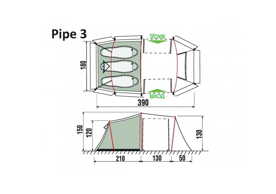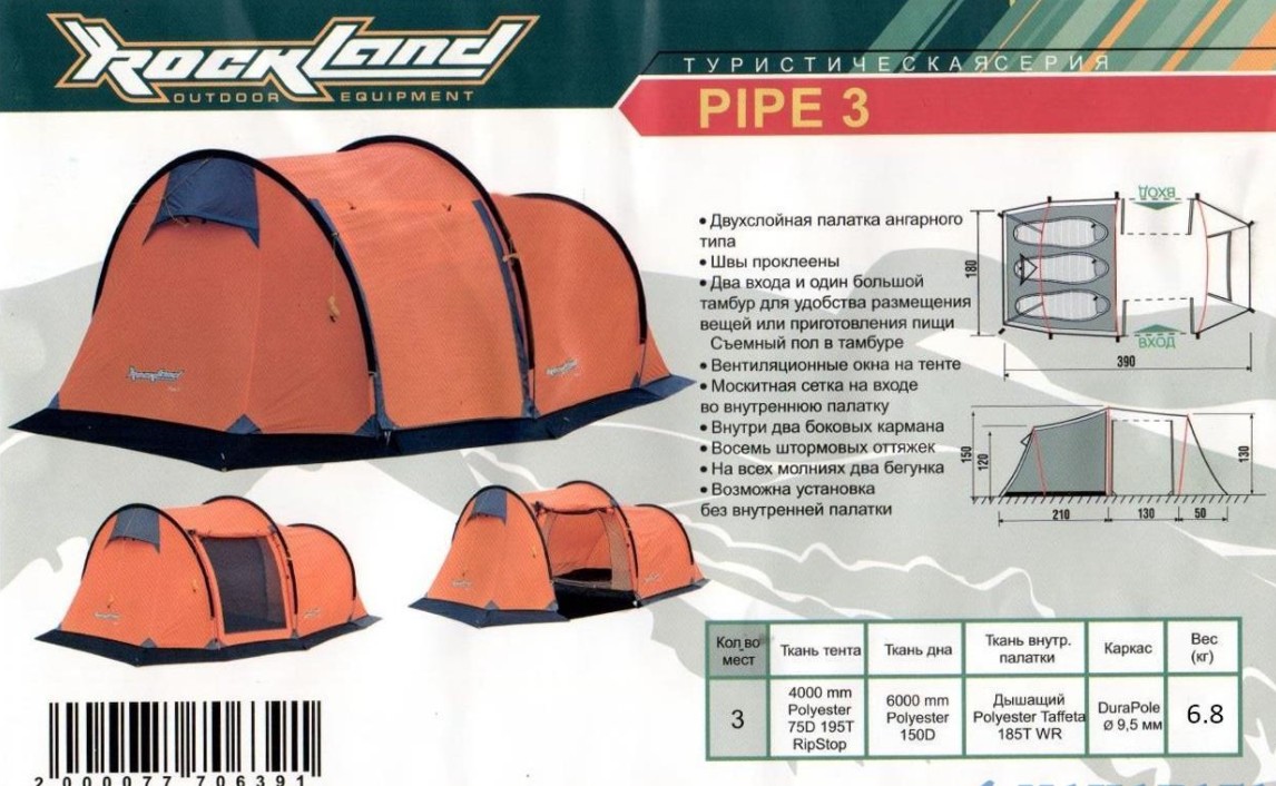 Палатка RockLand Pipe 3 - туристическая двухслойная палатка ангарного типа, рассчитанная на 3х человек.