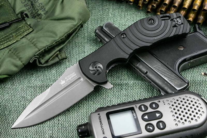 Нож имеет шпеньки для удобного открывания как левой, так и правой рукой. Клинок фиксируется в закрытом состоянии надежным линейным замком, который удерживает клинок от закрытия, упирая металлическую пластину (лайнер) под открытый клинок.