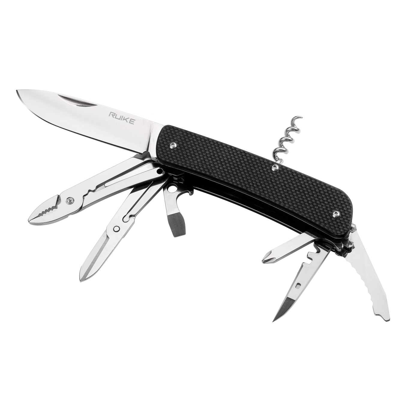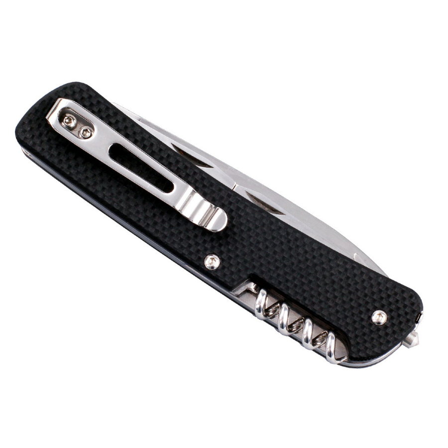 К дополнительным инструментам в модели Ruike L41 относится целый ряд не менее полезных приспособлений. С нижней стороны рукоятки, так же, как и нож, достается пила для дерева и открывалка для бутылок, которая также служит небольшой прямой отверткой и помогает снять изоляцию с проводов. Со стороны хвоста рукоятки, также снизу, достается стропорез с еще одной прямой отверткой – меньшего размера. С верхней стороны рукоятки пользователь найдет выдвижной штопор. А в торце ручки ножа размещен стеклобой и стальное кольцо, которое можно использовать для крепления темляка.