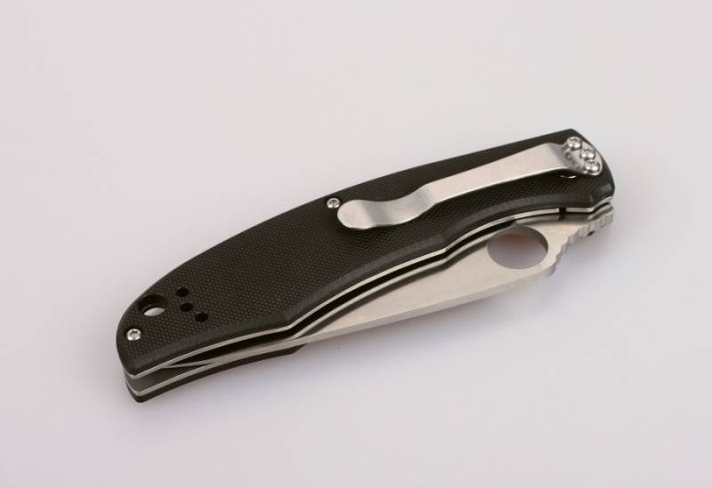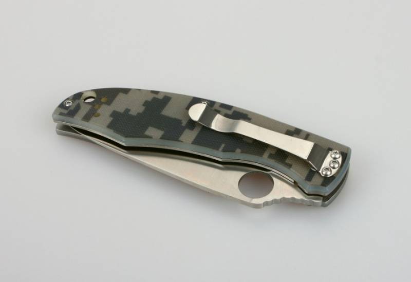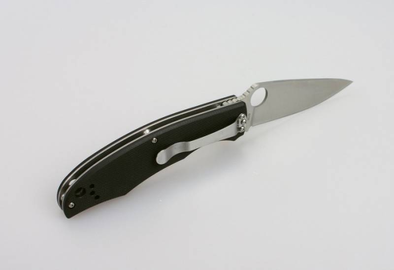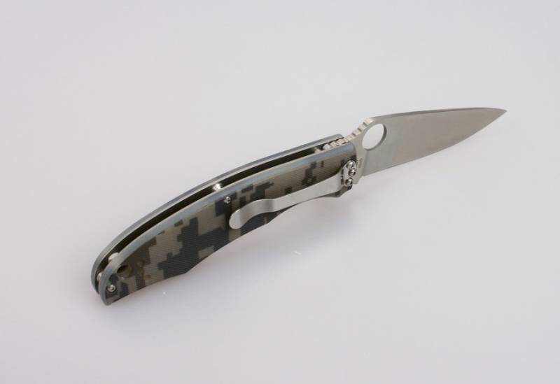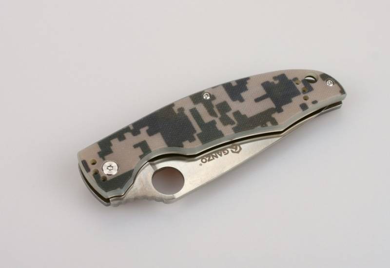 Основа рукоятки Ganzo G732 также металлическая, но на металле закреплены накладки из G10. Это современный вид композитного пластика, состоящего из стекловолокна и эпоксидной смолы. Ему легко придать необходимую форму и окрасить накладки в выбранный цвет. Так, данная модель может быть с черной, оранжевой, зеленой и камуфляжной рукояткой. В хвосте рукоятки есть небольшое отверстие для присоединения темляка. А ближе к клинку прикручена металлическая клипса для поясного ремня, которая держится на трех болтах.