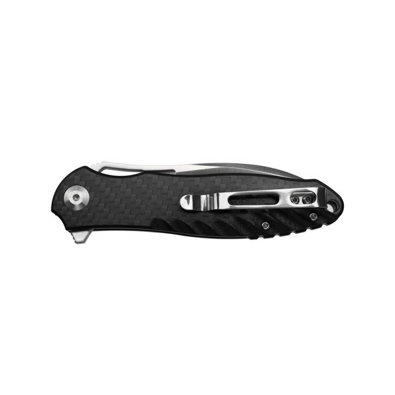 Специфика ножа заключается в наличии характерных выемок на рукоятке. Они придают модели характерный дизайн. Цвет рукояти темно-серый, материалом послужило углеродное волокно.