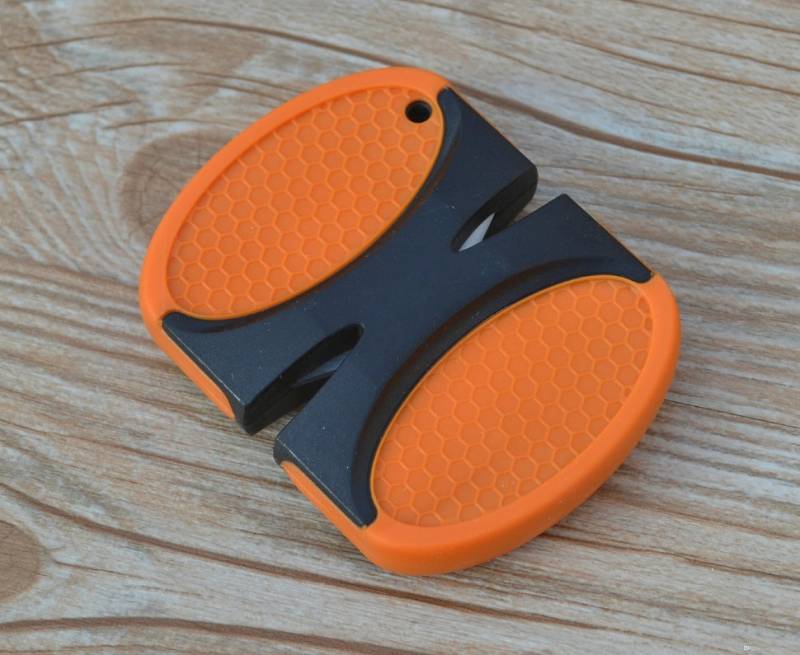 Одна из поверхностей модели сделана из карбид-вольфрама, и подходит для грубой заточки сильно затупившихся лезвий. Вторая поверхность из керамики служит для тонкой заточки и финишной обработки. Для затачивания инструмента установите его на жесткую и не скользкую поверхность. Затем необходимо удерживать лезвие прямо и несколько раз плавно провести от основания клинка к острию.