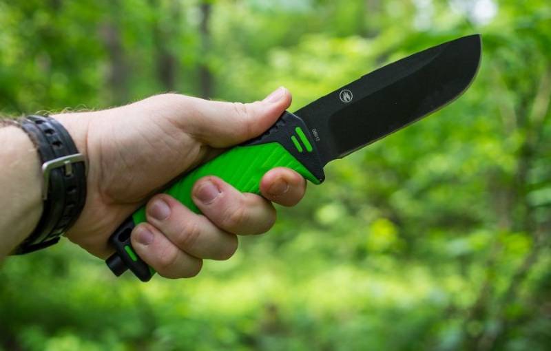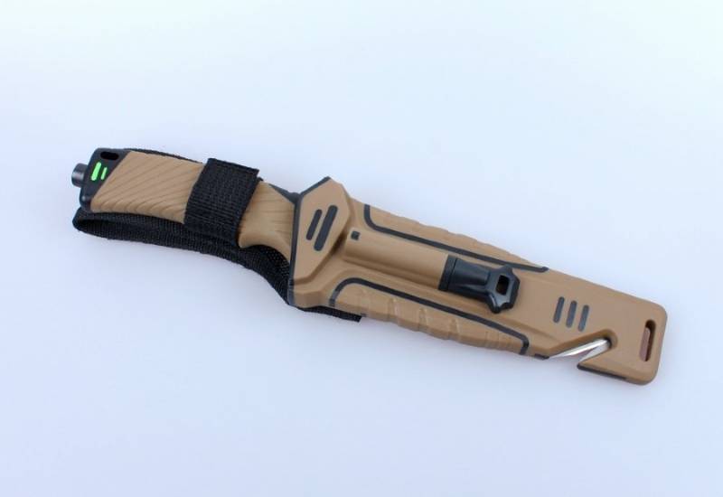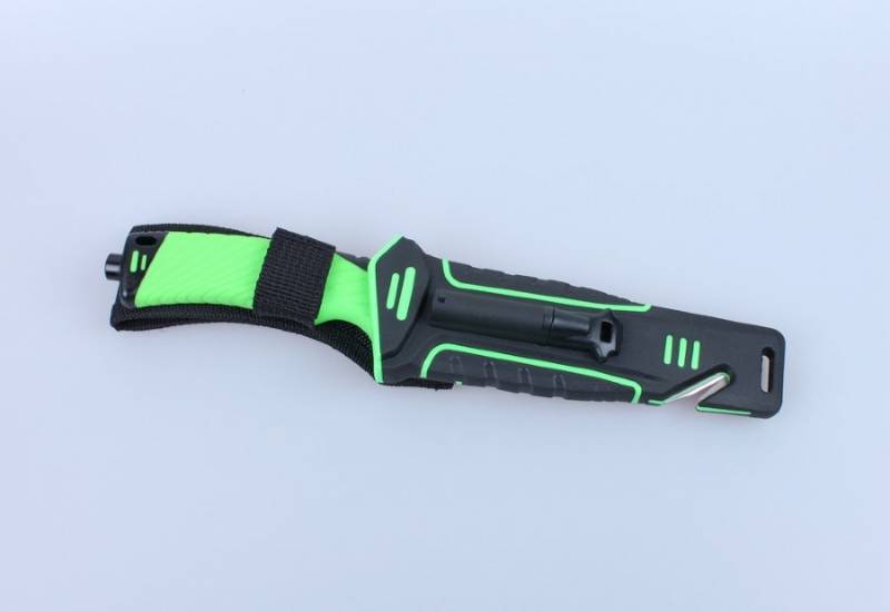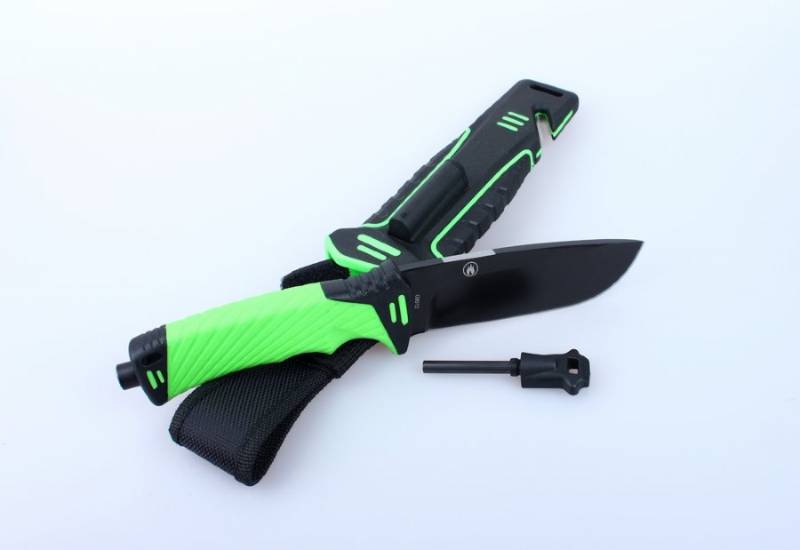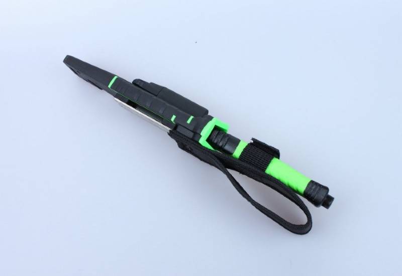 Не менее практичный подход у авторов данной модели и по отношению к рукоятке ножа. Она изготовлена из современной марки пластика — ABS. Этот материал очень прочный, хотя и легко принимает в процессе производства нужную форму. Рукоятку с небольшими бороздками можно очень крепко держать в руке, даже если ладони мокрые. А в торец ручки вмонтирован стеклобой, который может понадобиться в экстренных условиях.