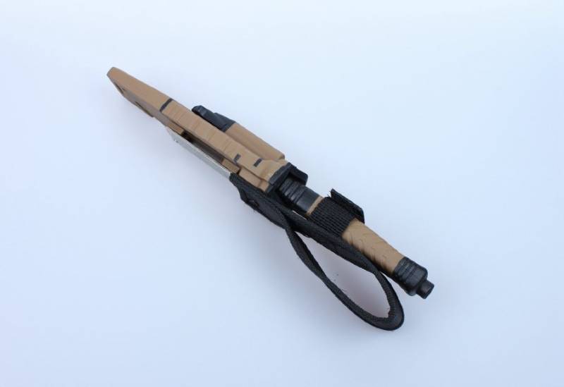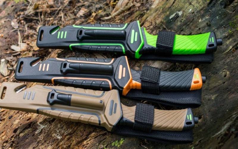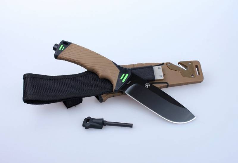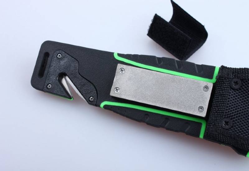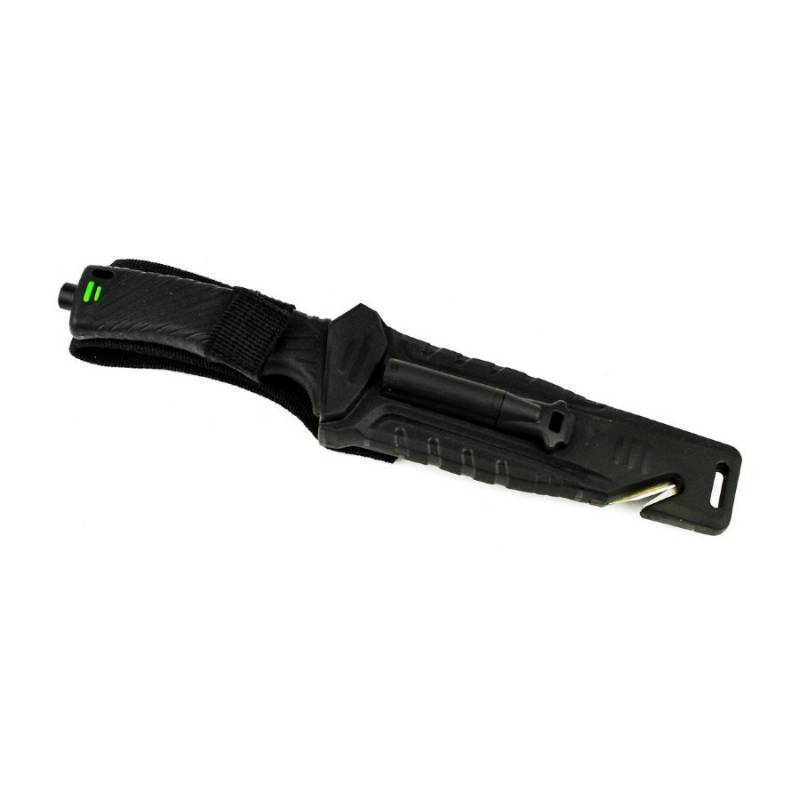 Очень важный элемент в этой модели — чехол для ножа. Он сделан из пластика и нейлона, а потому отлично защитит и нож от повреждений, и владельца ножа от случайных ранений или порчи остального снаряжения. С тыльной стороны чехла встроена точилка с алмазным напылением, которая поможет возобновить остроту гладко заточенного участка. Помимо того, в чехле есть стропорез, а с обратной от точилки стороны встроено огниво, которое можно вынуть и использовать самостоятельно.