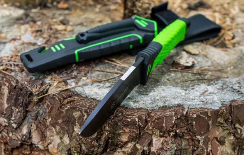 Модель Ganzo G8012 ориентирована не только на любителей рыбалки или охоты, но и на настоящих экстремалов, выезжающих в самые отдаленные от благ цивилизации районы. Поэтому нож создан надежным, практичным и максимально функциональным. Его клинок изготовлен из качественного сплава — нержавеющей стали 7Cr17. Этот металл закаляется до 57HRC, за ним легко ухаживать, его несложно затачивать. Длина клинка ножа составляет 11,5 см. Его поверхность выглядит достаточно необычно благодаря черному покрытию. Оно не просто выполняет декоративную роль, но и способствует лучшей защите от коррозии, а также избавляет от бликов на солнце. Стильный дизайн дополняет комбинированная заточка ножа. Участок около рукоятки заточен мелкими зубчиками, а остальная часть — ровная. Так что нож подходит абсолютно для любых материалов и видов работ. С его помощью можно и бутерброды приготовить, и разрезать туристические веревки или же выполнить другие виды работ.