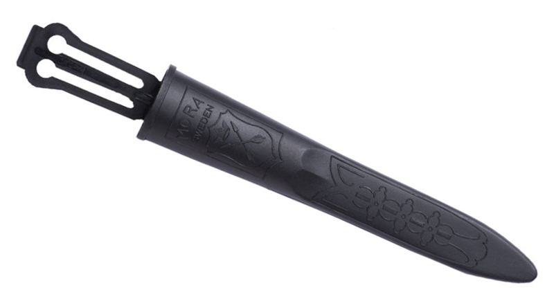 Полированное лезвие ножа Мора 612 из углеродистой стали дополняют гарда и рукоять бордового цвета из шведской березы.