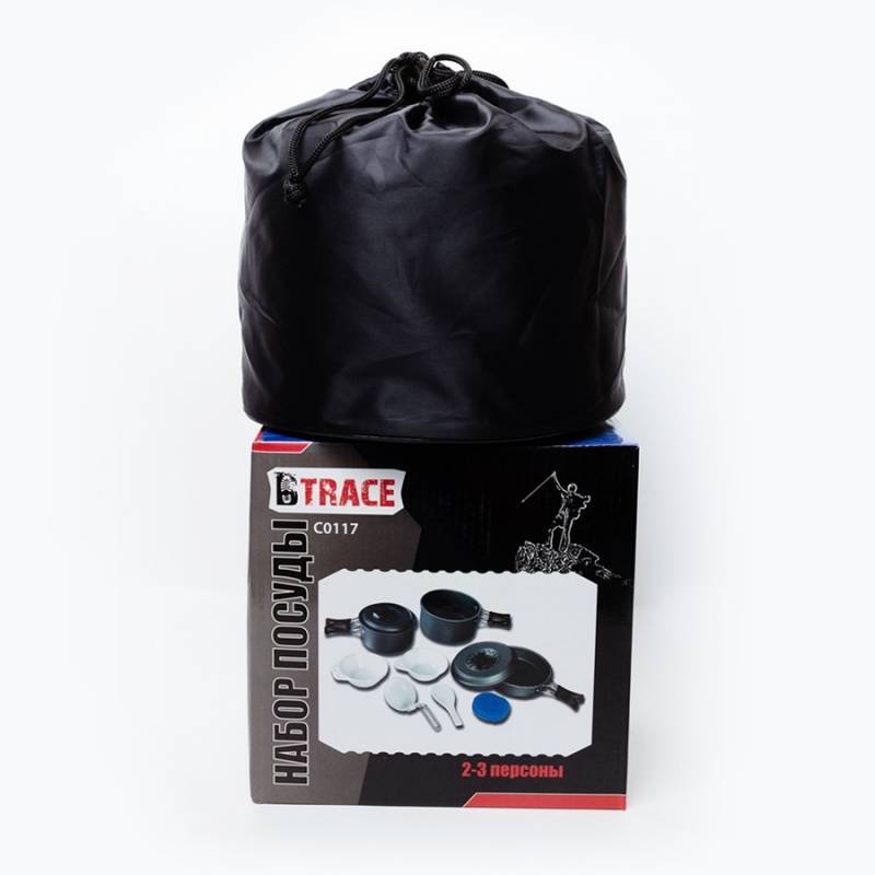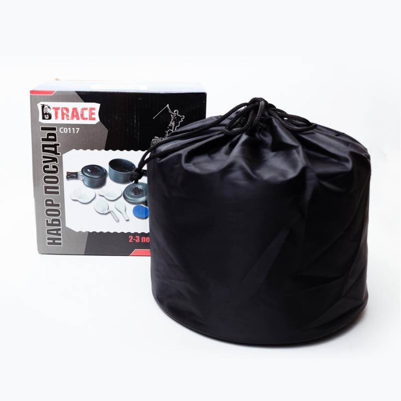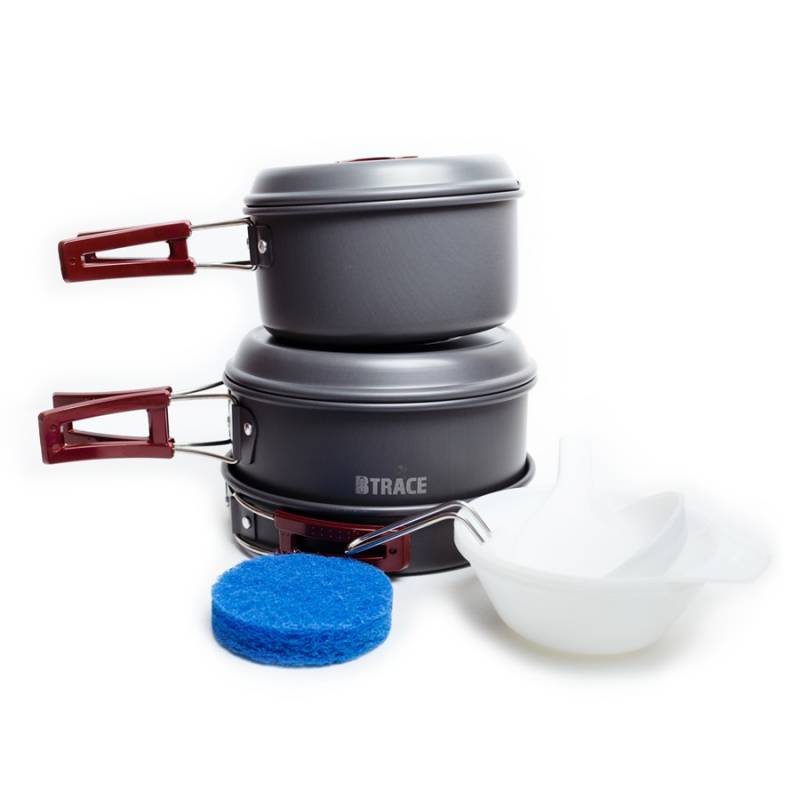 Компактный и лёгкий набор посуды из анодированного алюминия на 2-3 персоны BTrace С0117, включающий в себя всё что необходимо туристу для приготовления пищи на природе. Данный комплект идеален для использования с портативными туристическими газовыми плитами. Набор туристической посуды BTrace С0117 - это комплект посуды включающий в себя: Большой котелок объёмом 1,8 литра, со складными ручками и крышкой! Крышка имеет отверстие для отвода пара; Малый котелок объёмом 1 литр, со складными ручками и крышкой! Крышка имеет отверстие для отвода пара; Сковороду диаметром 177 мм. со складными ручками; Лопатку; Поварёшку, со складной ручкой; 3 глубокие пластмассовые тарелки объёмом 180 мл; Губку для мытья посуды из анодированного алюминия. Набор компактно складывается и упаковывается в плотный чехол.