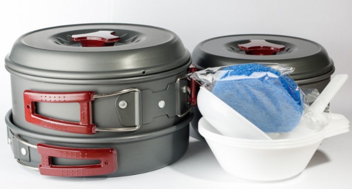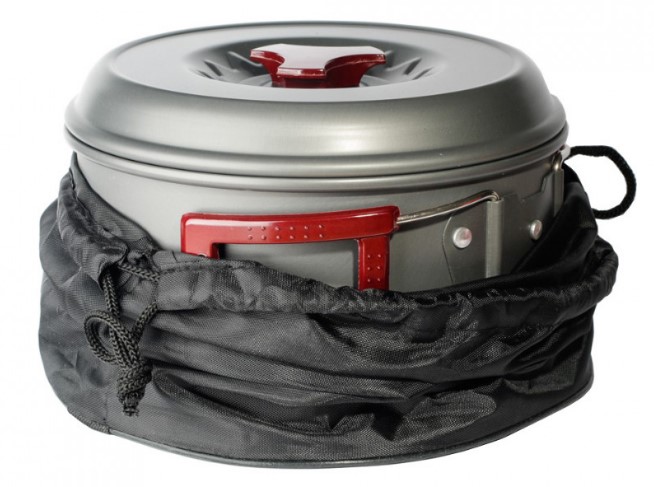 Набор походной посуды на 2-3 персоны. Котелки и сковорода изготовлены из анодированного алюминия - легкого, прочного и долговечного материала, обладающего высокой теплопроводностью. Набор занимает минимальный объем при переноске и хранении - все предметы складываются друг в друга и упаковываются в прочный мешочек из синтетической ткани. В комплекте: Котелок 1,8 л с крышкой и складными ручками, 1 шт. Котелок 1 л с крышкой и складными ручками, 1 шт. Сковорода Ø 177 мм со складными ручками, 1 шт. Ложка суповая, 1 шт. Поварешка, 1 шт. Тарелка глубокая пластмассовая, 3 шт. Губка для мытья посуды, 1 шт. Тканевый чехол, 1 шт.