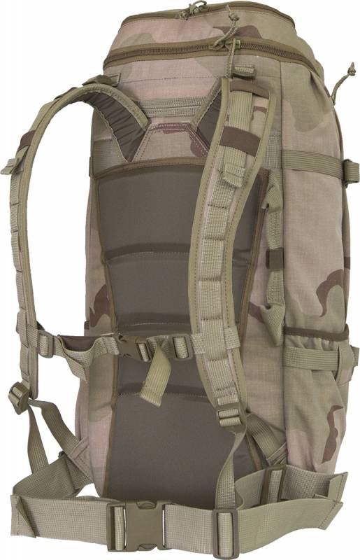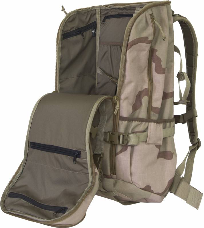 Главной отличительной особенностью является откидной фасад рюкзака. Такая конструкция позволяет полностью раскрыть основной объем. Карман сверху рюкзака. Вспухающие карманы на боковинах на молнии. Карманы в нижней части боковин. Четыре внутренних кармана. Карман для питьевой системы. Две пары боковых стяжек. Фиксирующий пояс. Дополнительные внутренние стяжки. Узел лямок — не регулируется, наполнение лямок — EVA. Конструкция спины: металлический каркас + пластик. Характеристики: Основной материал: Cordura 900D PU (оригинальная расцветка Desert Camouflage Uniform-DCU), стропа фурнитура повышенной износостойкости. Вес: 1,85 кг.