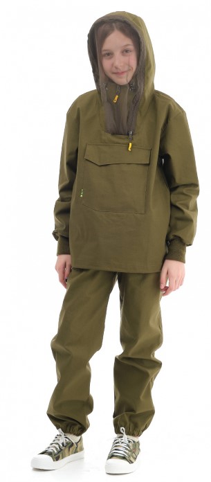 Детский костюм «Антигнус» в расцветке хаки представляет собой классический антимоскитный костюм из плотной хлопковой ткани палатка. Он состоит из удлиненной куртки типа «анорак» с капюшоном и брюк прямого кроя. Сетка накомарника съемная и легко убирается в потайной карман. Плотная ткань создает надежную защиту, позволяет телу «дышать» и надежно защищает от насекомых. Рукава оснащены плотными трикотажными манжетами. Этот костюм отлично подойдет для всех, кто много бывает в лесу. Верх: палатка Состав: 100% хлопок