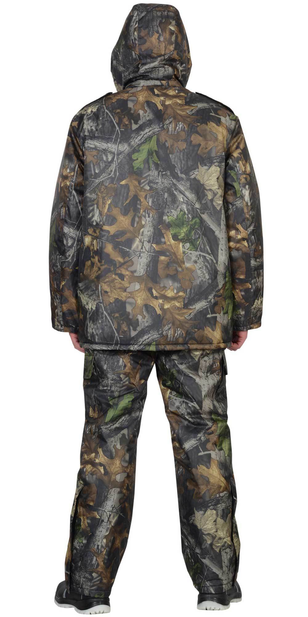 Утепленная куртка с удлиненной спинкой, отстегивающийся капюшон, ветровая планка, молния с двухходовым замком, нижняя и поясная кулиски, вентиляция, регулируемые манжеты с дополнительными трикотажными манжетами. Четыре кармана на груди с молнией и планкой, два двойных кармана внизу с держателем патронов, два внутренних кармана. Утепленный полукомбинезон с регулируемым поясом, снизу молнии с планкой до колена, нижняя регулировка ширины, два внутренних кармана с молнией и планкой, два боковых накладных кармана с клапаном. Материал мембранный HydroProofUltra, швы проклеены, подкладка трикот.