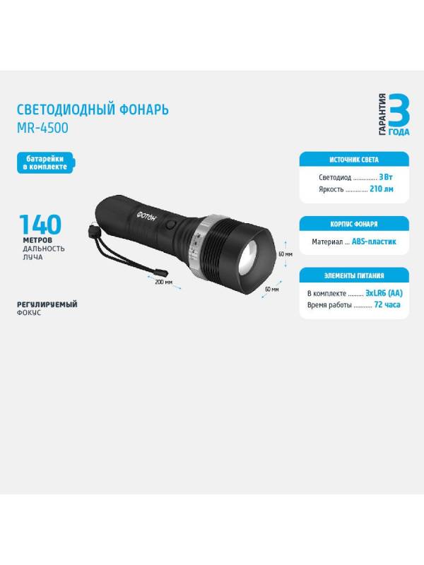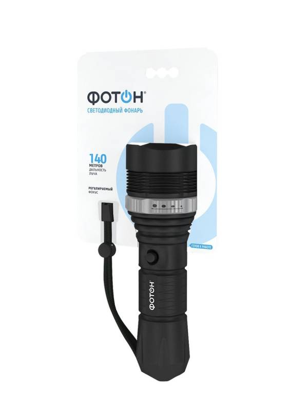 Фонари «ФОТОН» на батарейках с регулируемым фокусом обладают повышенным временем автономной работы на одном комплекте батареек. Их характеристики идеальны для того, чтобы брать с собой в походы или поездки.Корпус из резинопластика позволяет фонарю надёжно лежать в руке и не скользить. Фокусировочное кольцо для плавной регулировки угла рассеивания света от широкого до направленного. Лёгкий вес благодаря использованию современных материалов и батареек формата АА (пальчиковые). Долгое время работы фонаря – до 72 часов на одном комплекте алкалиновых батареек «ФОТОН». Батарейки 3xLR6 в комплекте. Источник света – 3W светодиод.