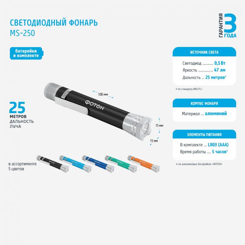 Фонарь Фотон MS-250 – компактный универсальный прибор с одним светодиодом на 0.5 Вт. Устройство действует при световом потоке 47 лм, а дальность луча достигает 25 метров. Прочный алюминиевый корпус обладает защитой степени IP54. Устройство Фотон MS-250 действует от одной батарейки-мизинчика (AAA), идущей в комплекте. Полного заряда хватает на 5 часов непрерывной работы. Особенностью конструкции является наличие торцевой кнопки выключения, а также удобной клипсы-держателя. Компактный прибор весит всего 67 г и обладает размерами 1.5x10x1.5 см.