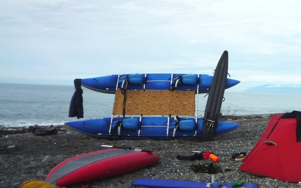 При монтаже рамы, передняя поперечная труба продевается в глухой карман палубы. В карман палубы с вырубленными сегментами вставляется труба Ф18 мм. и за нее палуба притягивается к задней поперечной трубе каркаса. Лентами  с люверсами, закрепленными на палубе, она растягивается к продольным трубам правого и левого баллонов катамарана и крепится на болтах соединения труб.
